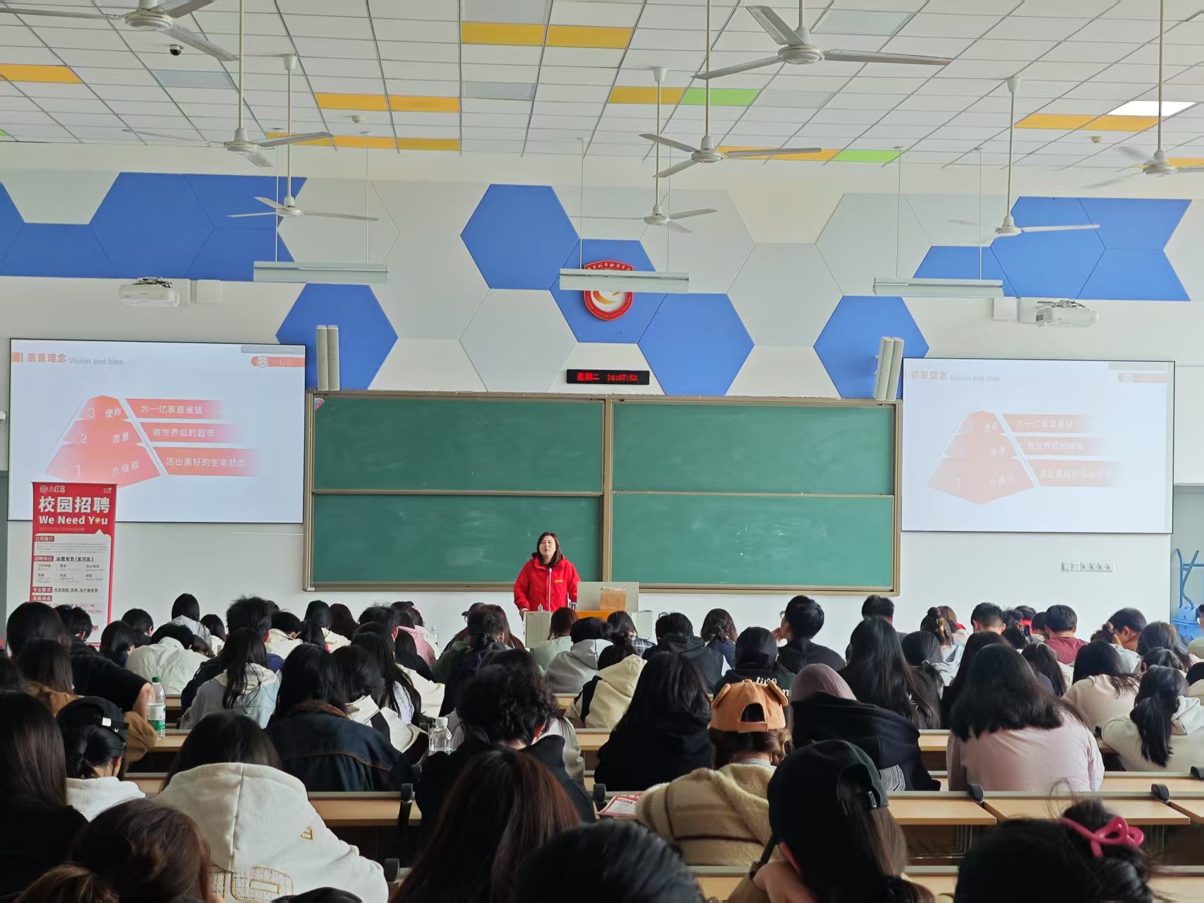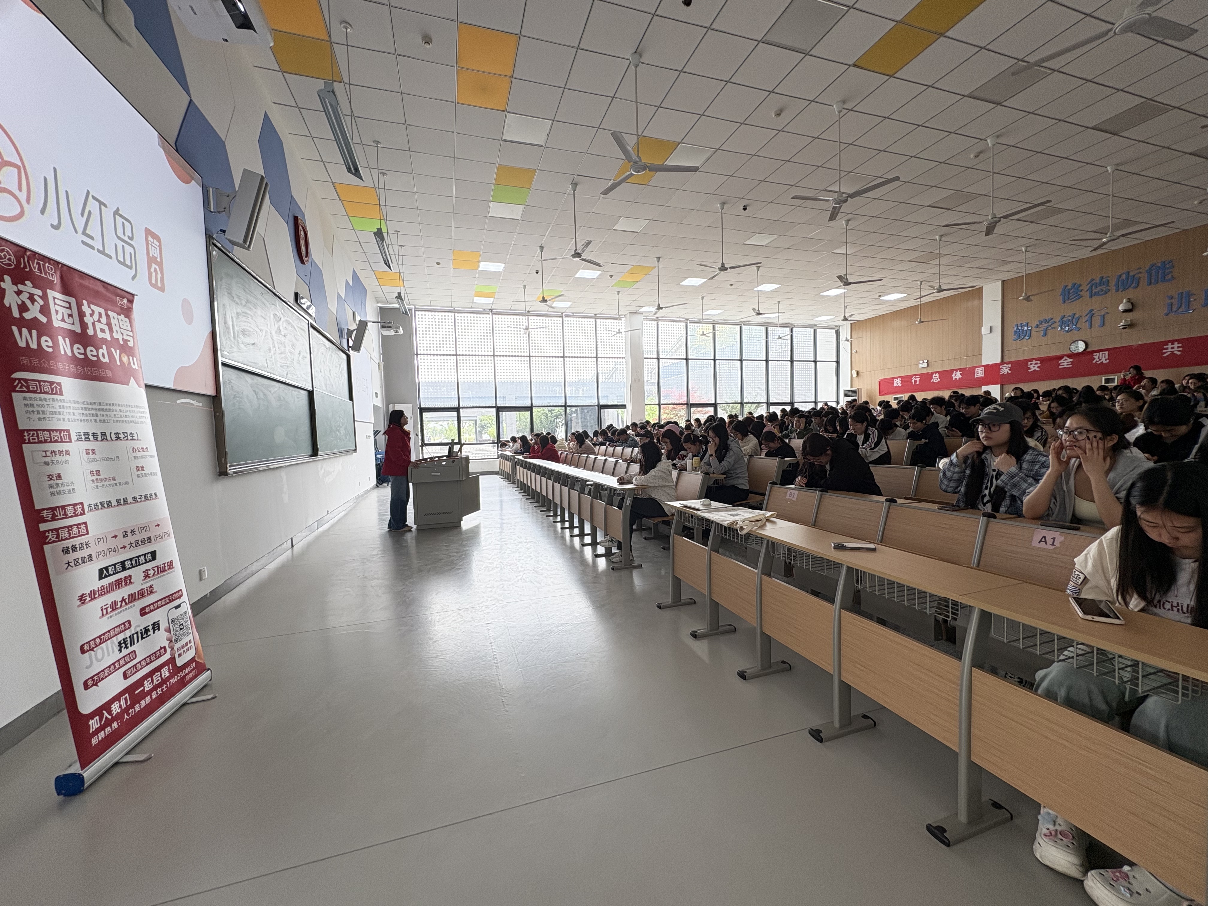 宣讲会伊始,梁珊珊女士详细介绍了南京小红岛超市的发展历程、企业文化和经营理念。小红岛超市自成立以来,秉持着 “品质至上,服务第一” 的理念,不断发展壮大,在南京地区拥有众多门店,深受消费者喜爱。她通过生动的案例和详实的数据,展示了超市在零售行业中的地位以及未来的广阔发展前景,让同学们对企业有了清晰的认知和深刻的印象。