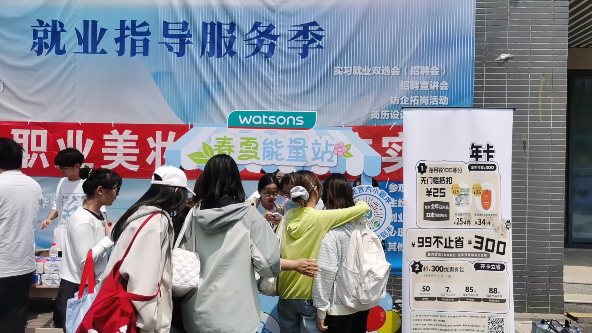 活动以“青春体验官”为主题,在食堂门口等人流密集区域设立沉浸式体验区。屈臣氏团队带来美妆、健康产品,通过互动游戏等形式传递品牌理念;社团成员化身“产品顾问”,结合专业知识为师生讲解产品成分与市场定位。现场还设置“职场微课堂”,屈臣氏区域经理分享行业趋势与求职技巧,为学子搭建从校园到职场的桥梁。